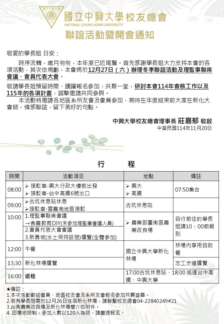敬請學長姐預留時間、踴躍報名參加,共聚一堂,研討本會114年會務工作以及115年的各項計畫,誠摯邀請共同參與。