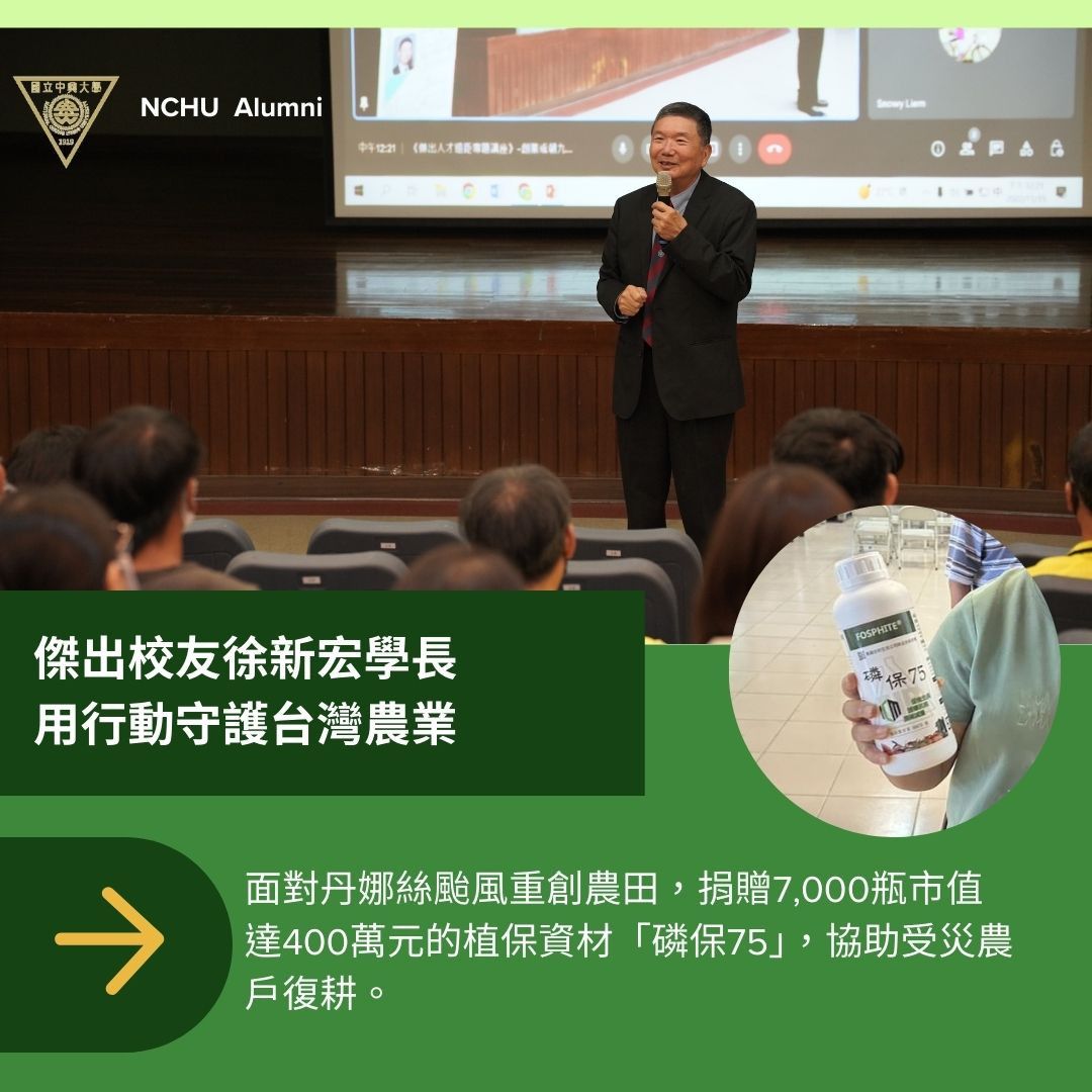 為協助受丹娜絲颱風影響的農戶加速復耕、恢復產能,中興大學大數據中心執行長、佳和農化企業董事長徐新宏免費提供7,000瓶市價4百萬元的植保資材「磷保75」給受災農戶,9月起陸續發送,期望藉以降低病害風險,幫助農民渡過災後復耕難關。