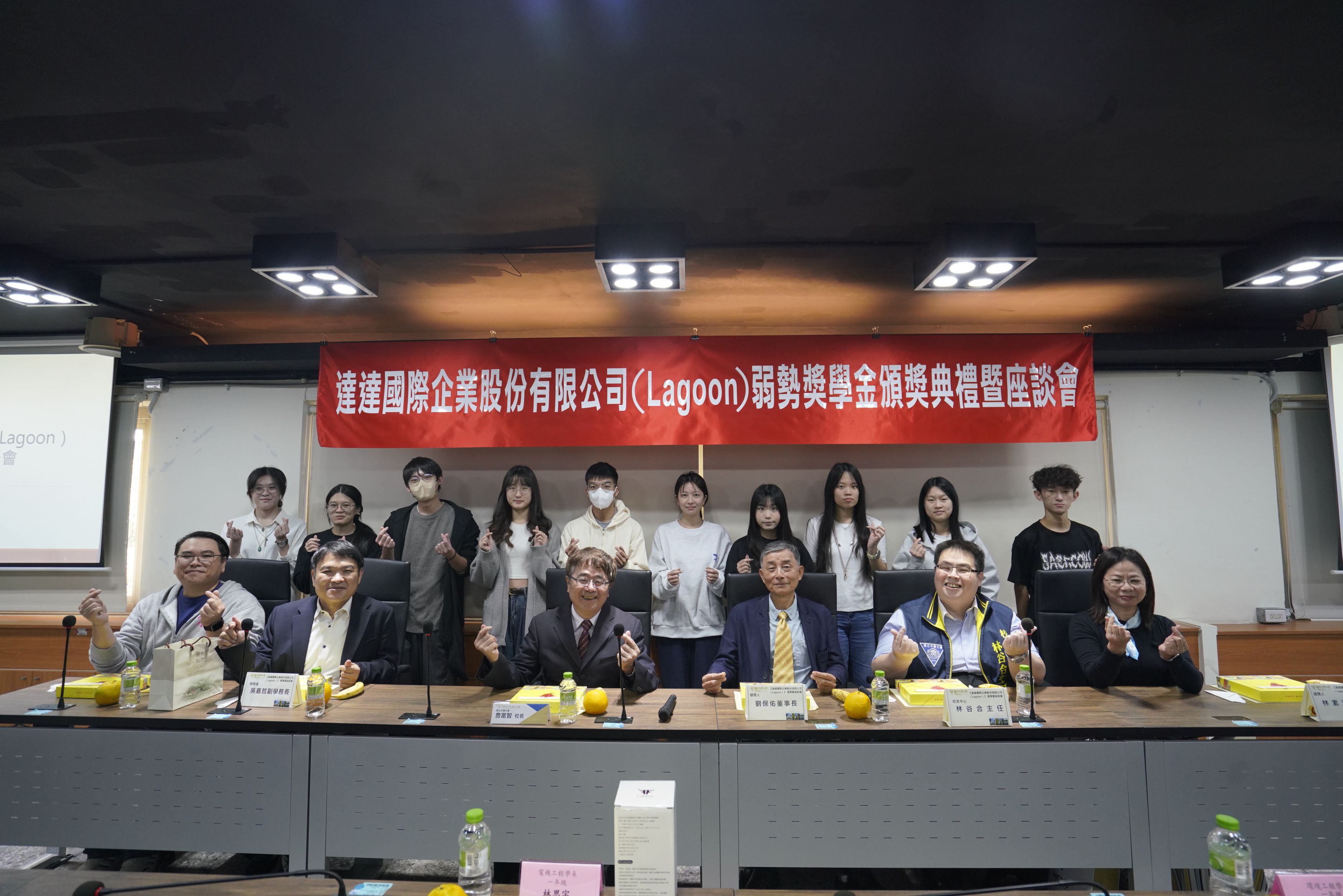 今日國立中興大學舉辦「達達國際企業股份有限公司(Lagoon)弱勢獎學金」頒獎典禮,劉保佑學長與獲獎同學進行面對面的溫馨座談。本校詹富智校長、吳嘉哲副學務長、校友中心林谷合主任及學務處生輔組舒博智組長皆親臨與會;獎學金委員屏東科技大學農園生產系林素汝副教授,同時也是本校農藝系畢業校友,亦特別返校參與。
