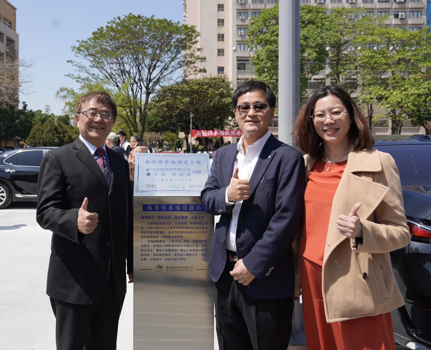 鑫成營造股份有限公司、國立中興大學EMBA暨層峰興學院超EMBA校友何献崇學長慷慨捐資興建的「南園停車場」,響應國立中興大學持續推動「友善環境、幸福校園」的發展願景,為校園交通與空間規劃帶來更完善的發展。