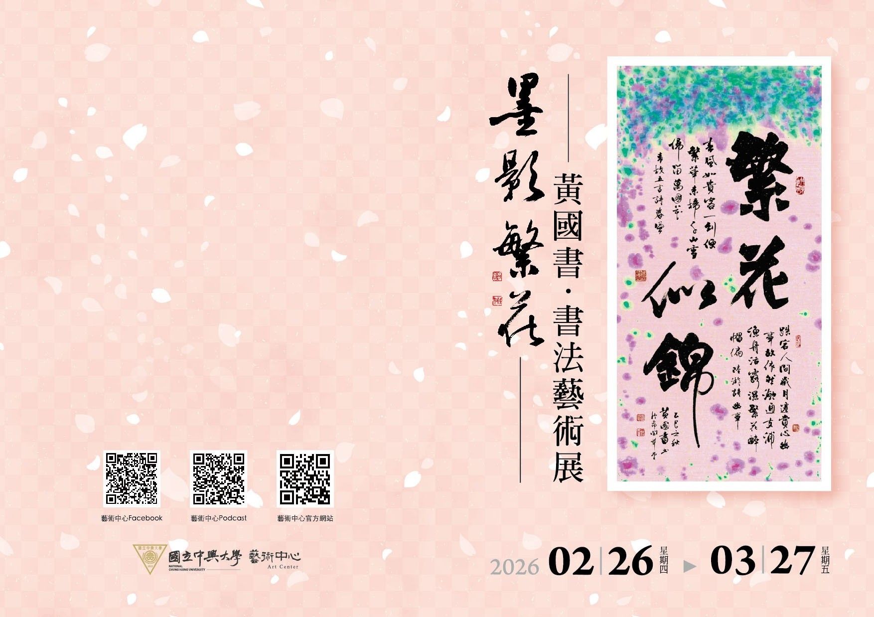 僅訂於115年二月二十六號(四)至三月二十七日(五),舉辦「墨影繁花—黃國書書法展」。肅柬奉邀,敬請光臨指教