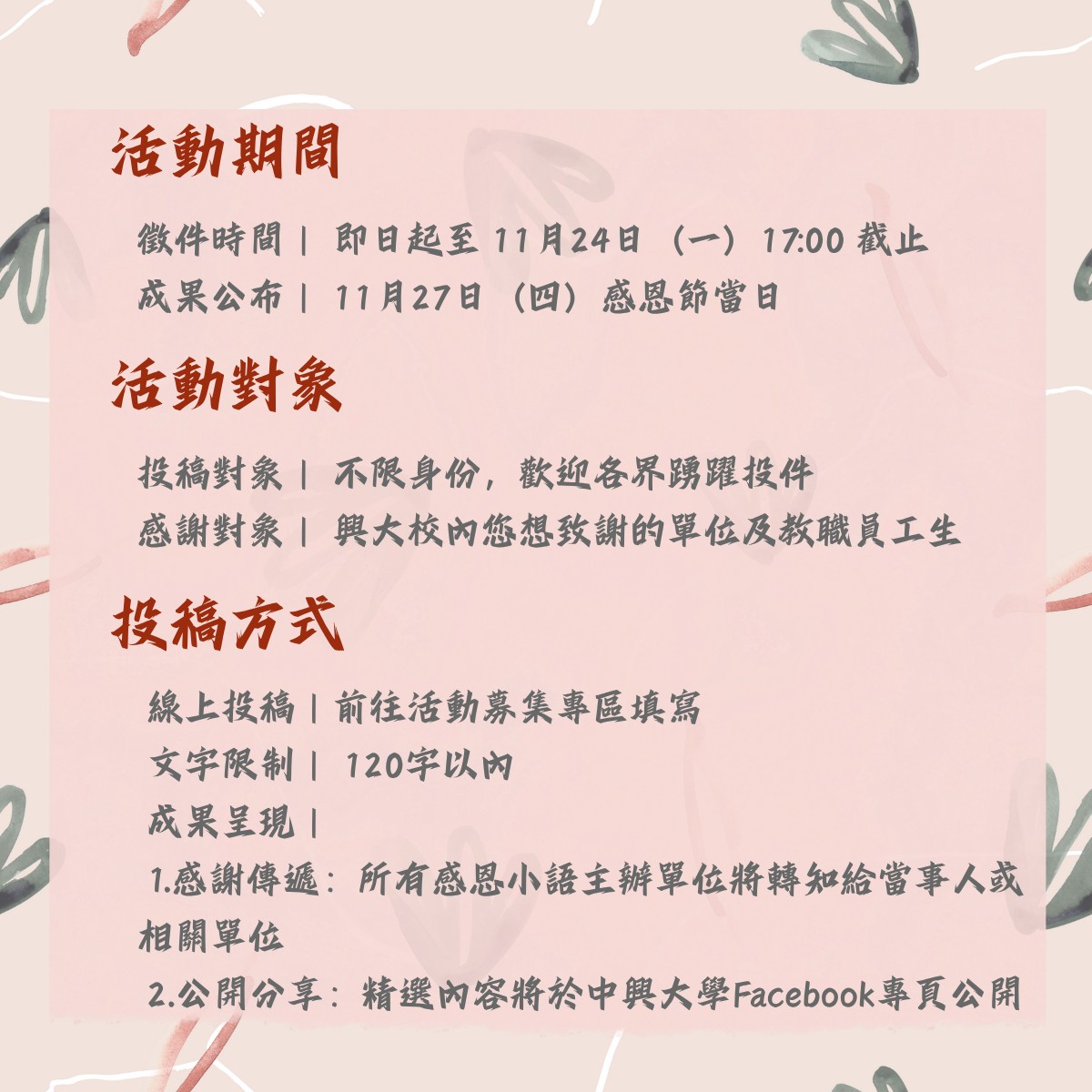 歲末將至,讓我們用一句感謝,延續善意。中興大學邀請您參加【感恩小語募集活動】,