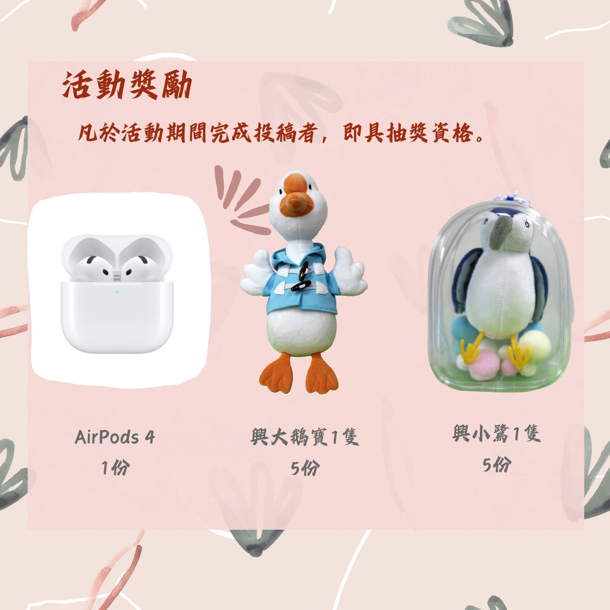 抽獎獎品| AirPods 4 ×1份、興大鵝寶 ×5份、興小鷺 ×5份