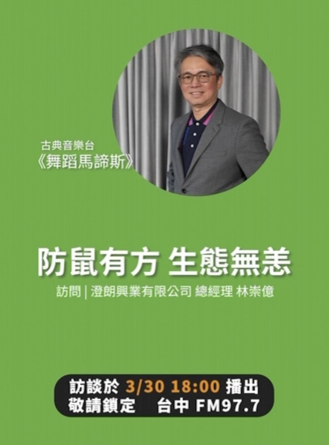 【活動資訊】3/30 澄朗興業有限公司總經理 林崇億學長,受邀登上古典音樂台節目,與您一起在優美的古典樂聲中,認識生態保育與有害生物管理的重要性!
