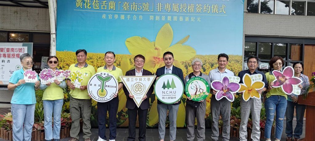 率先登場為「台南5號」授權簽約儀式,由臺南區農業改良場授權予中興大學實驗林管理處,雙方將攜手推動新品種蘭花在景觀營造、校園綠美化及居家栽培等領域的應用與推廣。曾被列為國內瀕危的野生苞舌蘭,在農業改良場的努力下,陸續育成新品種,首見的黃色大花「台南5號」為大型苞舌蘭品種,花色亮眼的黃色大花,花莖可超過75公分,花期長達3個月,具備抗病性強、栽培管理容易等優勢。未來將由興大實驗林管理處新化林場進行推廣與銷售,帶動園藝產業的新風貌。